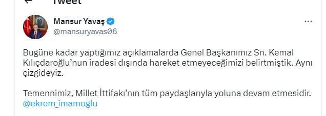Yavaş açıklamasında, ”Bugüne kadar yaptığımız açıklamalarda Genel Liderimiz Sn. Kemal Kılıçdaroğlu’nun iradesi dışında hareket etmeyeceğimizi belirtmiştik. Tıpkı çizgideyiz. Temennimiz, Millet İttifakı’nın tüm paydaşlarıyla yoluna devam etmesidir.” ifadelerini kullandı.