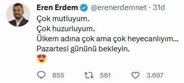 Kemal Kılıçdaroğlu’na yakınlığı ile bilinen CHP’li Eren Fazilet toplantı sonrası toplumsal medya hesabından, “Çok memnunum. Çok huzurluyum. Ülkem ismine çok ancak çok heyecanlıyım… Pazartesi gününü bekleyin.” bildirisini paylaştı.