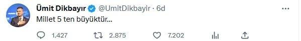 Dikbayır “Millet 5’ten büyüktür” paylaşımını kısa bir müddet sonra sildi.