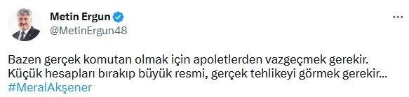 İYİ Parti Lokal İdareler Lideri ve Muğla Milletvekili Metin Ergun da ‘apolet’ göndermesinde bulunarak “Bazen gerçek kumandan olmak için apoletlerden vazgeçmek gerekir. Küçük hesapları bırakıp büyük resmi, gerçek tehlikeyi görmek gerekir” dedi.